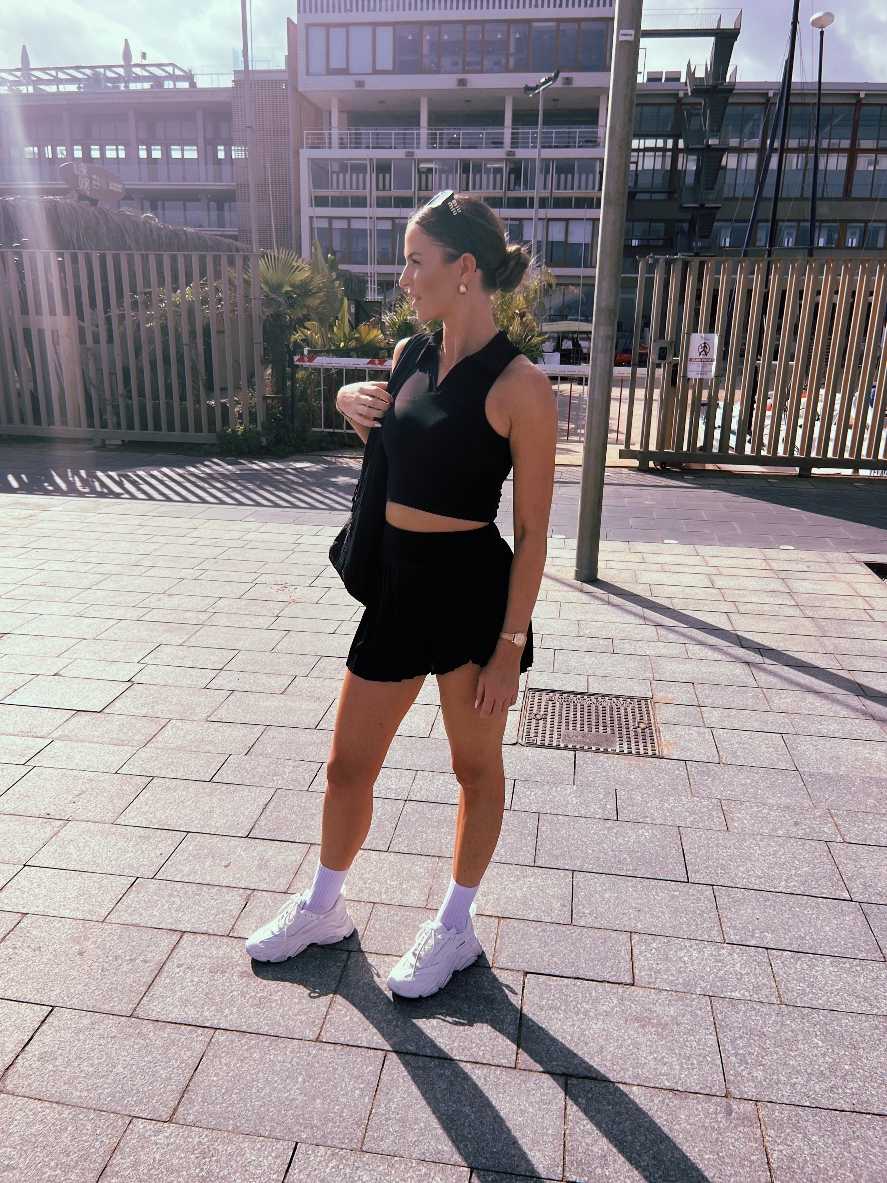 Elegant meets active: This 2-piece set combines a sleek, fitted long-sleeve top with a sporty tennis-style skirt for the perfect balance of style and function. The soft, stretchy nylon fabric ensures comfort and flexibility whether you're playing tennis, hitting the gym, or running errands. Available in stylish colors like lilac, black, light blue, and white.