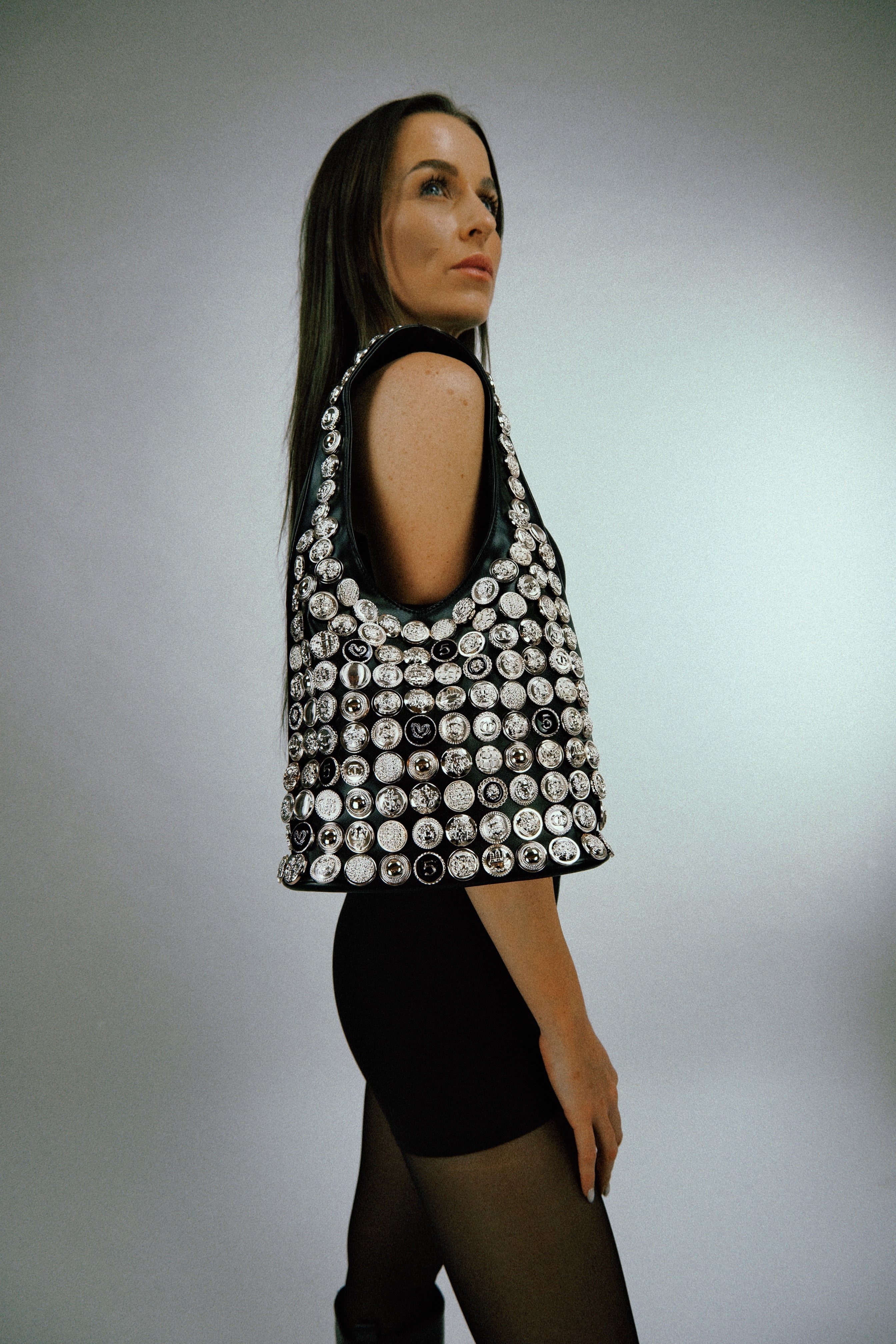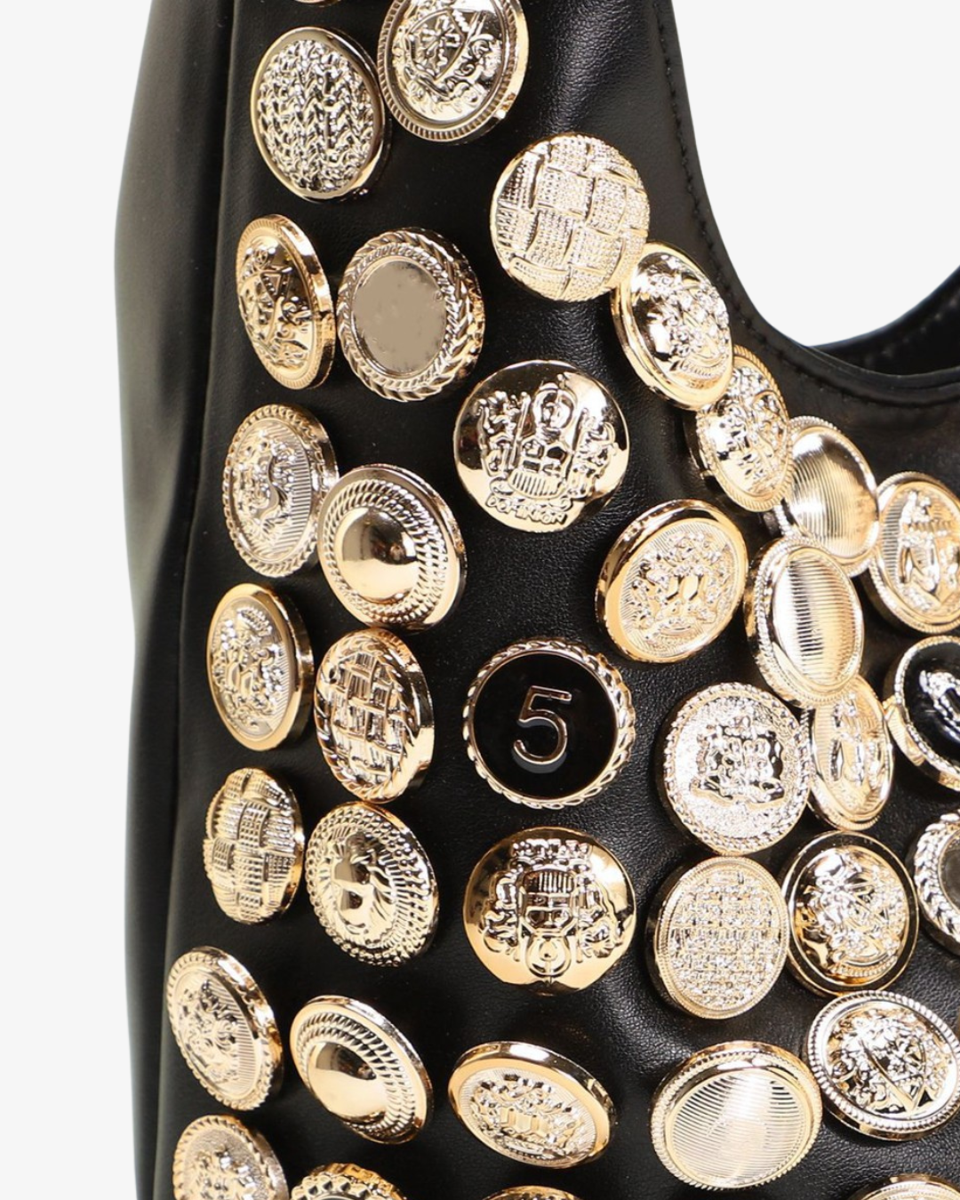 Make a glamorous entrance with this one-of-a-kind embellished shoulder bag, covered in shimmering buttons and metallic accents. Carefully hand-decorated and designed to stand out, this bag is a true statement piece that turns any outfit into a look.